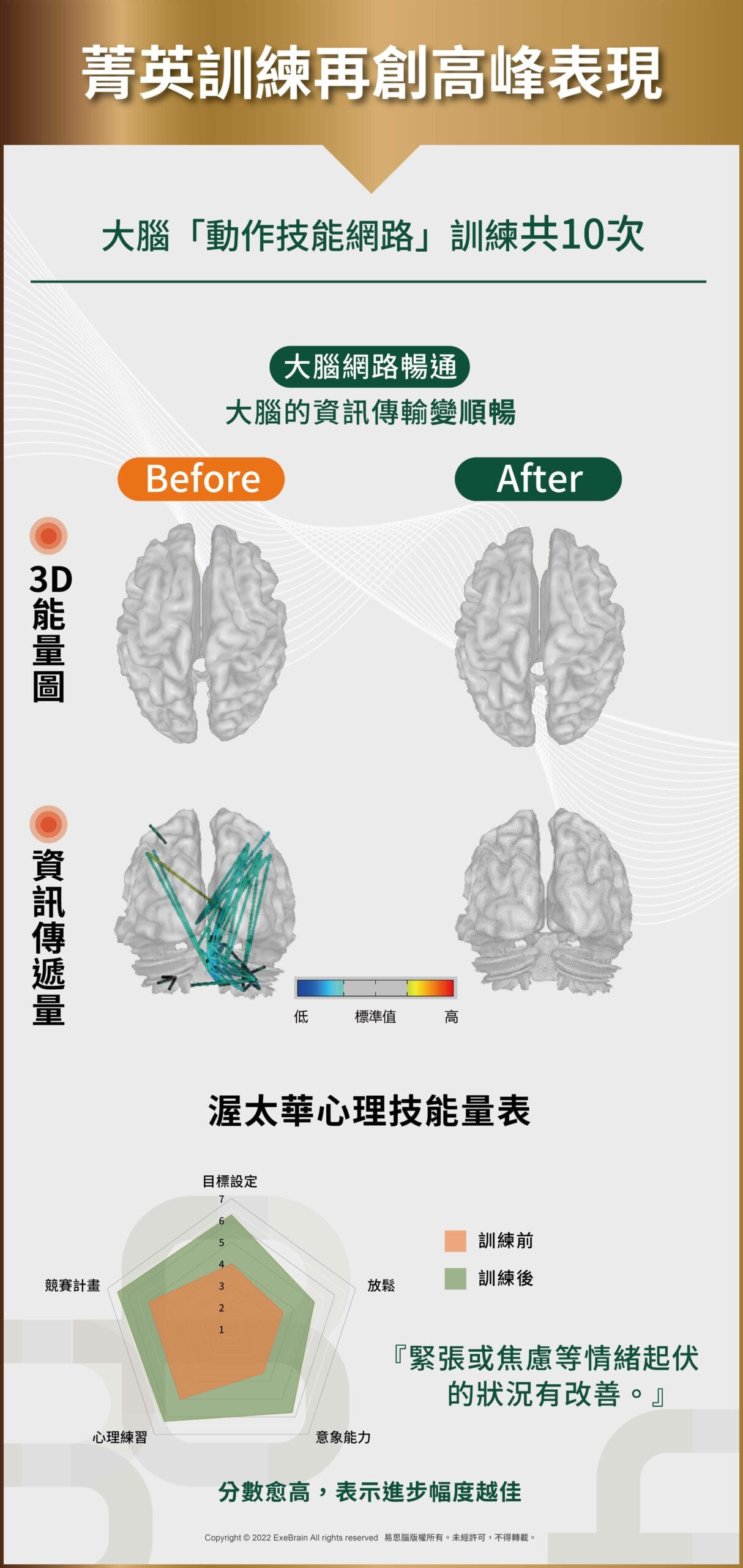 易思腦遵循BCIA美國生物回饋協會技術標準,為張閔勛量測全腦網絡,並規劃職棒選手專屬的神經回饋大腦訓練(Neurofeedback training),配合運動心理技巧,幫助他保持心態穩定。