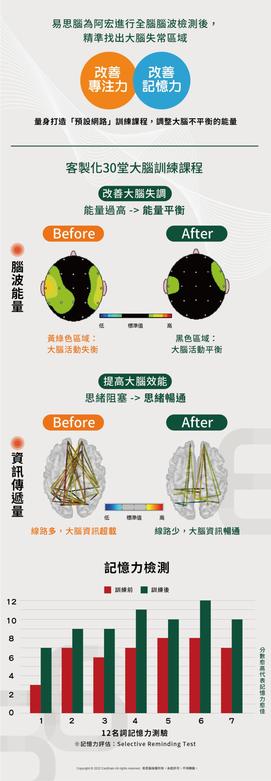 易思腦為阿宏進行全腦腦波檢測後,精準找出大腦失常區域,並量身打造「預設網路」訓練課程,調整大腦不平衡的能量,改善專注力、記憶力。
