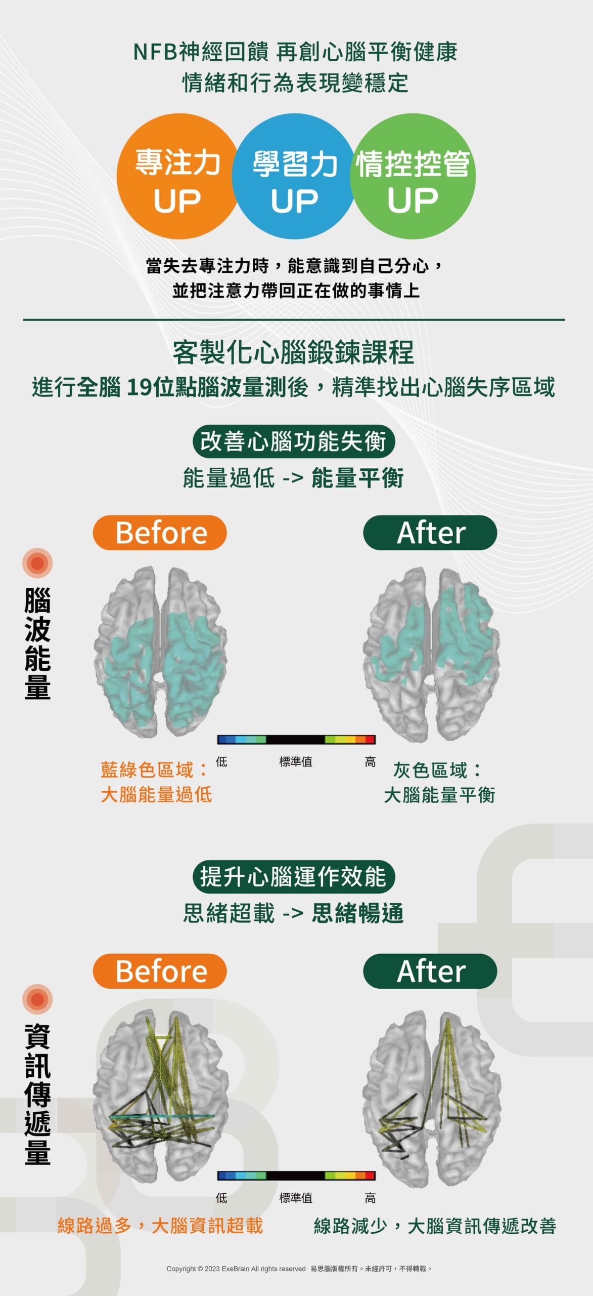 抱著嘗試的心態,來到易思腦,先進行19位點的QEEG腦波評量,它是將腦波訊號和資料庫即時比對分析;發現兒子掌管情緒和決策判斷的腦區神經連結失衡,因此心腦鍛鍊師幫他設計了客製化的課程,特別鍛鍊這兩個腦區。