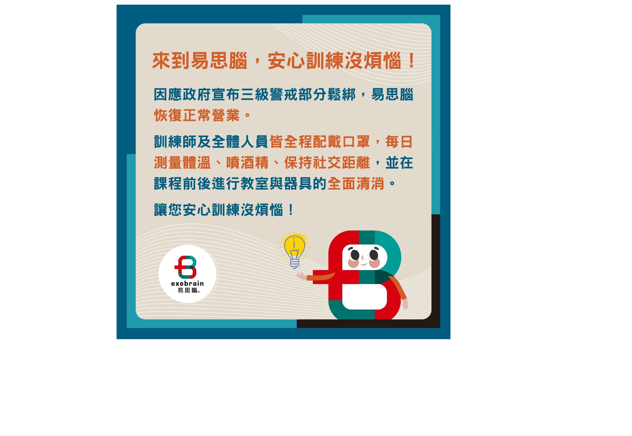來到易思腦,安心訓練沒煩惱 因應政府宣布三級警戒部分鬆綁, 易思腦自7/13起恢復正常營業。 [...]