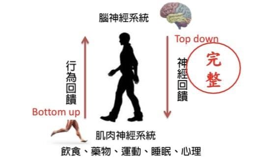 針對受損腦區專注力訓練(上到下)與受損肌肉行動功能訓練(下到上),兩者一起配合訓練的效果最佳。