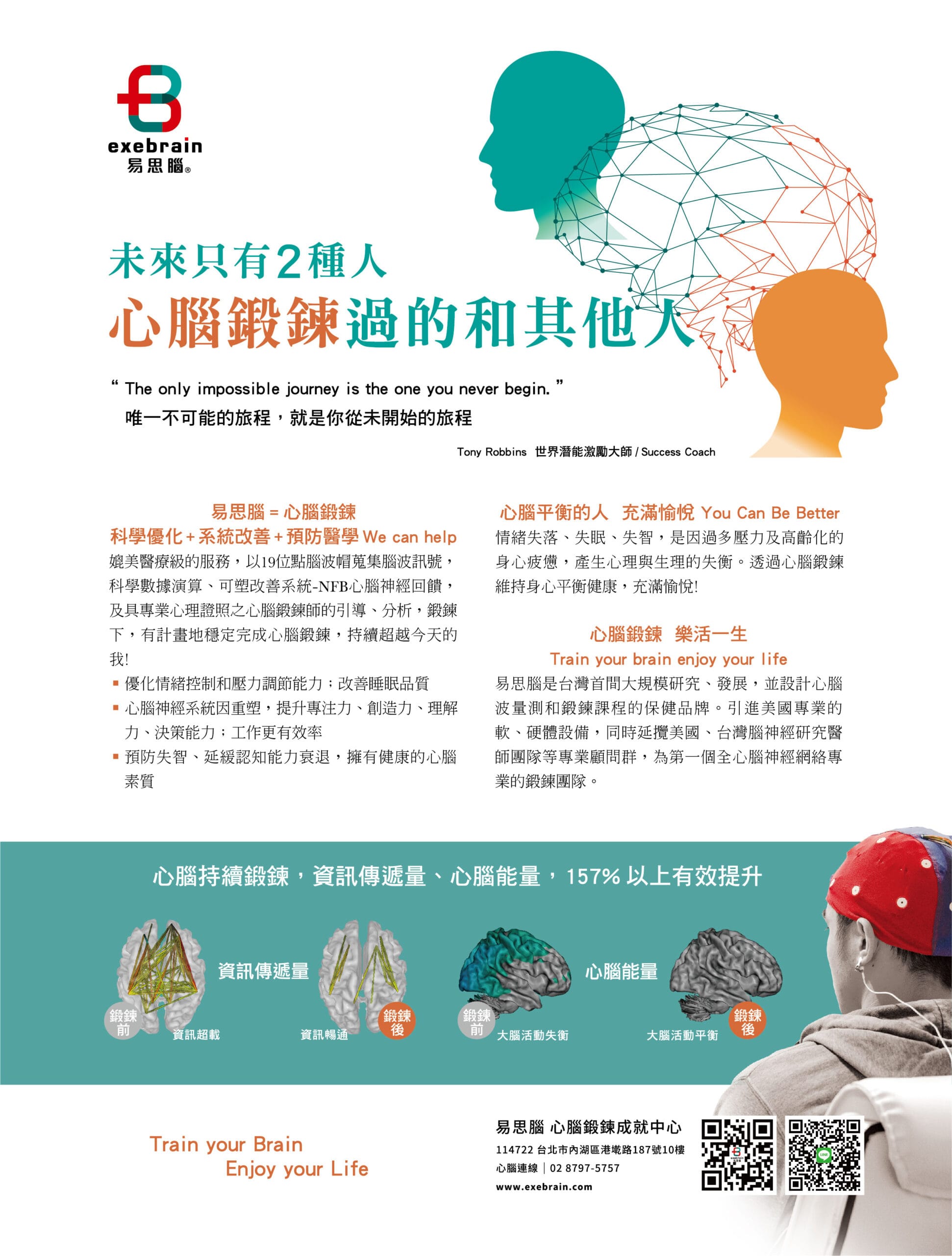 易思腦是台灣首間大規模研究、發展,並設計心腦波量測和鍛鍊課程的保健品牌。引進美國專業的軟、硬體設備,同時延攬美國、台灣腦神經研究醫師團隊等專業顧問群,為第一個全心腦神經網絡專業的鍛鍊團隊。